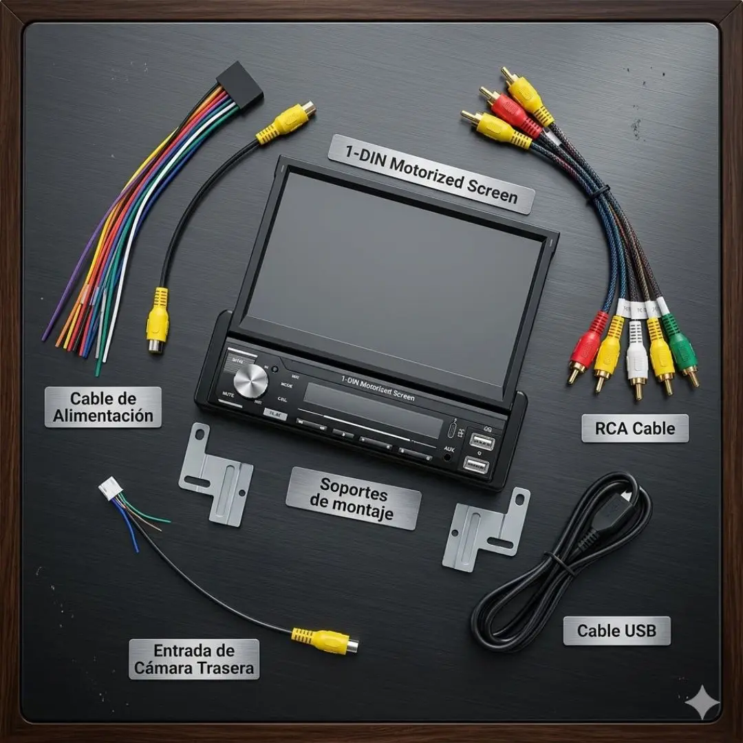 ✔ Cable de alimentación ✔ Cables RCA ✔ Entrada para cámara trasera ✔ Cable USB ✔ Soportes de montaje